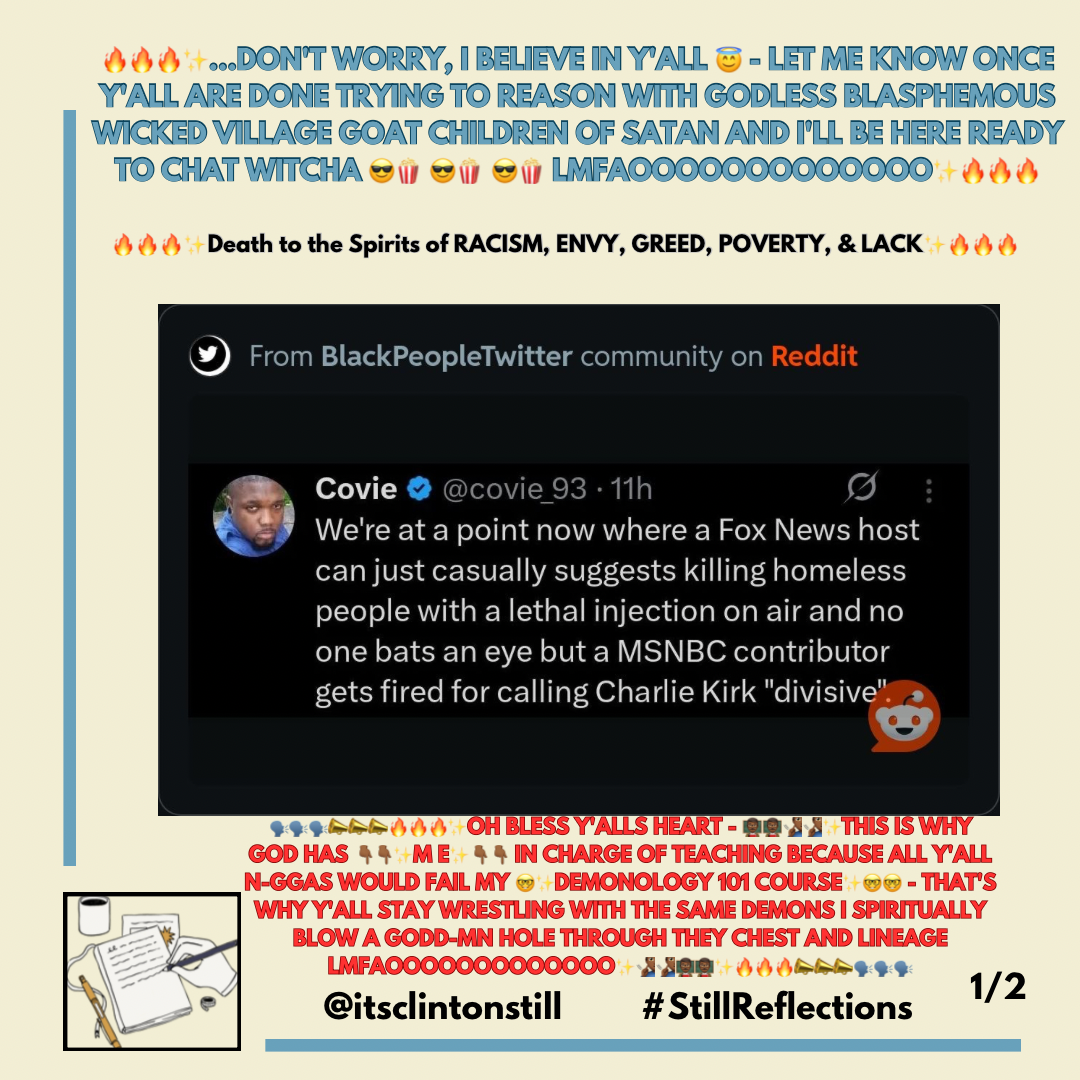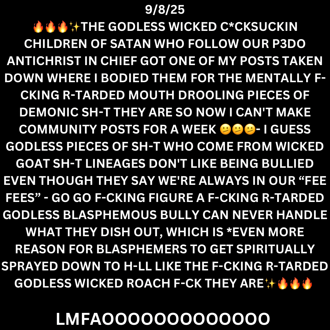 πŸ”₯πŸ”₯πŸ”₯✨ONE OF MY OPPS HAD A PSYCHOTIC/DEMONIC BREAK THIS MORNING AT ~3 AM WHEN I REFUSED TO LET HER USE MY LIGHTER AND BEFORE SHE GOT CHASED OFF BY ~6 OFFICERS AFTER CAUSING A LOUD SCENE, SHE WAS CRYING AND WAILING SCHIZO NOTHINGS AT THE TOP OF HER LUNGS, ONE OF THOSE THINGS BEING THAT “SHE WISHES GOD WOULD K-LL HER AND TAKE HER OUT OF HER MISERY” AND I, THE MAN OF GOD WHO WAS JUST STANDING AROUND BEING THE BROKEST, DIRTIEST, AND MOST HOMELESS I’VE EVER BEEN IN LIFE AND CAN’T EVEN SMOKE AND MIND MY OWN BUSINESS AT ~3AM WITHOUT GODLESS DEMONS LIKE HER HARASSING ME AND CAUSING A SCENE, THOUGHT TO MYSELF, “ME TOO, SIS, ME F-CKING TOO, BECAUSE I’M IMMORTAL SO UNLIKE YOU, I’M FORCED TO BE HERE EVERY DAY TO LIVE THROUGH THIS BULLSH-T EXPERIENCE YOU GODLESS F-CKING F-GGOT SSA DEMONS PUT ME THROUGH 🫀🫀🫀”✨πŸ”₯πŸ”₯πŸ”₯