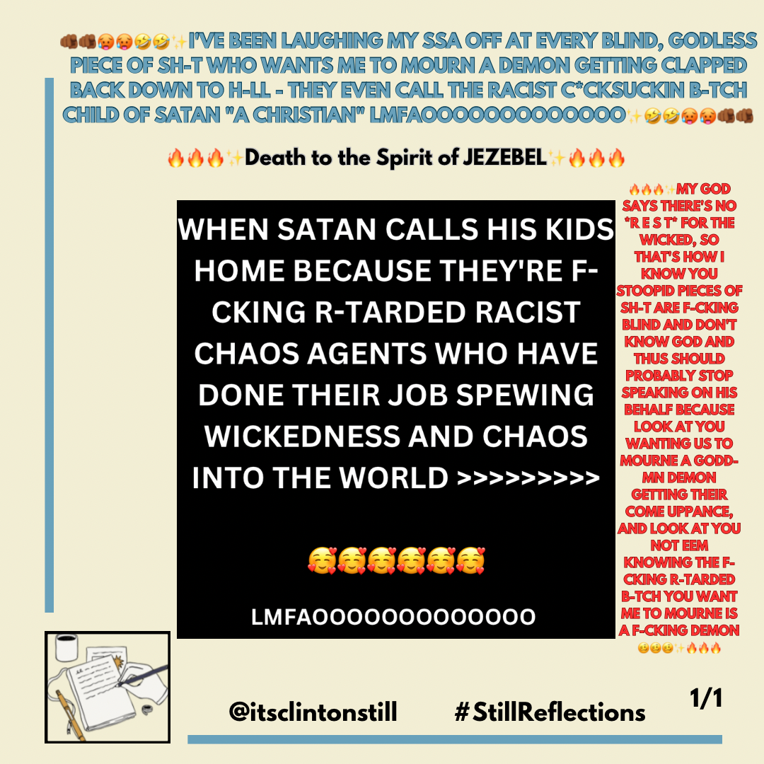 πŸ”₯πŸ”₯πŸ”₯✨YOU REMIND ME OF THE F-CKING R-TARDED CIA FUNDED DESCENDANT OF SLAVES SKIN WALKING SATANIC CHAOS AGENT WHO TRIED TO QUOTE THE BIBLE AT ME TOO JUST THE OTHER DAY – πŸ‘οΈπŸ‘οΈβœ¨I CAN TELL YOU DUMB BLASPHEMOUS CCKSUCKIN B-TCHES HAVE NEVER OPENED AND READ THE BIBLE TO CONNECT TO GOD EVER IN YOUR GODFORSAKEN LIVES AND YOU’LL GRASP AT ANY SCRIPTURE YOU CAN TO STRIKE ME, NOT EVEN CARING IF IT’S QUOTED OUT OF CONTEXT AND LASTLY, HOW FUNNY YOU QUOTE SCRIPTURE FROM EXODUS WHERE MOSES LED THE ISRAELITES OUTTA SLAVERY IN EGYPT AND I’M LEADING PEOPLE TO GOD AND FREEDOM OUTTA CORPORATE SLAVERY AND YOU’RE A LEARNING DISORDERED MENTALLY CHALLENGED POVERTY-CURSED BLASPHEMOUS HATIAN CMDUMPSTER SINGLE MOM JEZEBEL DEMON WHO IS A SLAVE TO THE DEVIL FOR A DOLLAR AND YOUR FATHER IN H-LL HAS NEVER EVEN REWARDED YOU FOR BEING A GODLESS DIPSH-T BLASPHEMER BECAUSE WHY HAVE YOU BEEN SO POOR IN YOUR REMEDIAL LIFE YOU’VE NEVER LEFT THE HOOD NOR HAVE YOU EVER BEEN ON AN AIRPLANE IN YOUR GODFORSAKEN 31 YEARS OF WASTED LIFE, YOU PREGNANT, UNMARRIED “WOMAN OF GOD”???βœ¨πŸ‘οΈπŸ‘οΈβœ¨πŸ”₯πŸ”₯πŸ”₯