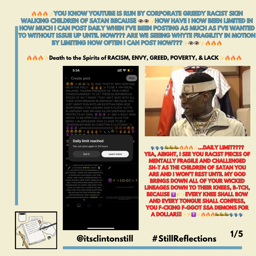 🔥🔥🔥✨YOU KNOW YOUTUBE IS RUN BY CORPORATE GREEDY RACIST SKIN WALKING CHILDREN OF SATAN BECAUSE 👁️👁️✨HOW HAVE I NOW BEEN LIMITED IN HOW MUCH I CAN POST DAILY WHEN I’VE BEEN POSTING AS MUCH AS I’VE WANTED TO WITHOUT ISSUE UP UNTIL NOW??? ARE WE SEEING WHYTE FRAGILITY IN MOTION BY LIMITING HOW OFTEN I CAN POST NOW???✨👁️👁️✨🔥🔥🔥